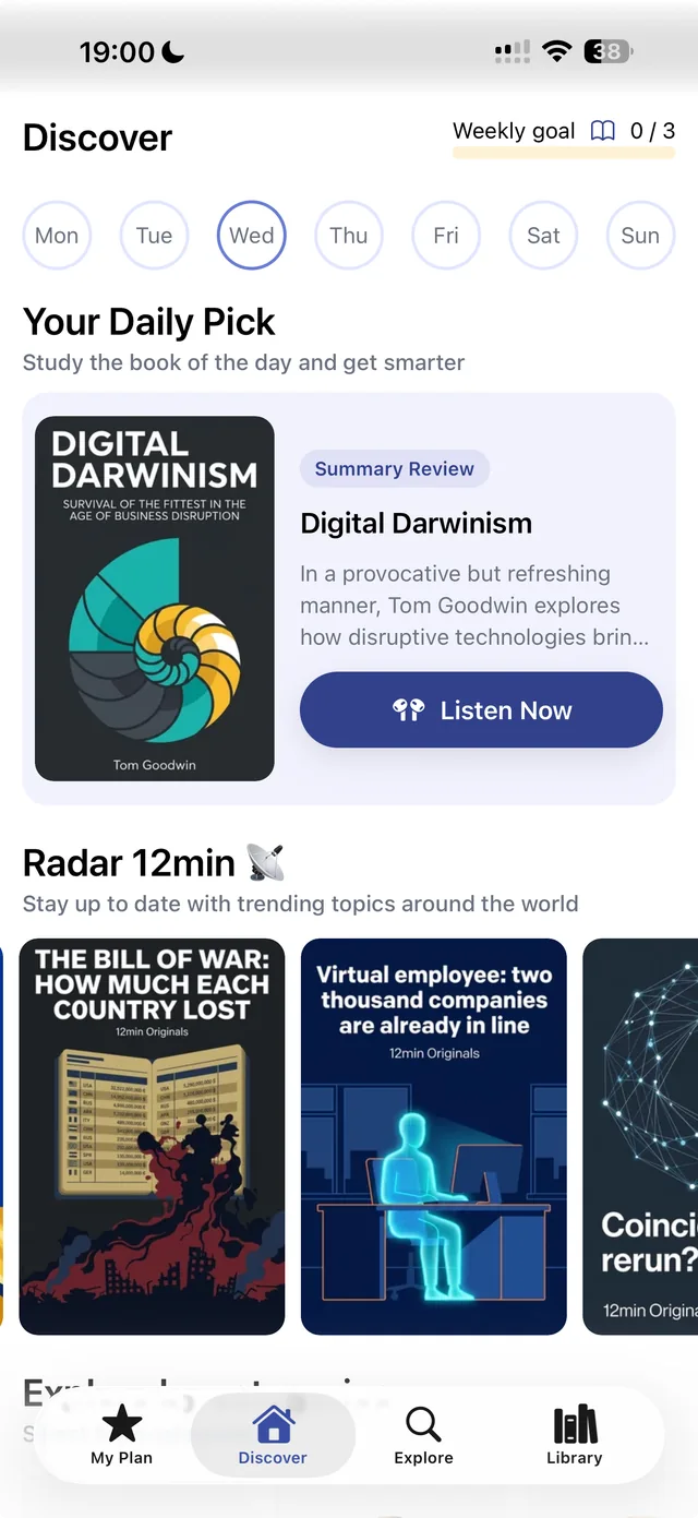 In the 12min App, we extract the best ideas and insights from the world's best-selling non-fiction books and organize them into unique, self-contained narrative summaries that can be consumed in audio and/or text in about 12 minutes!